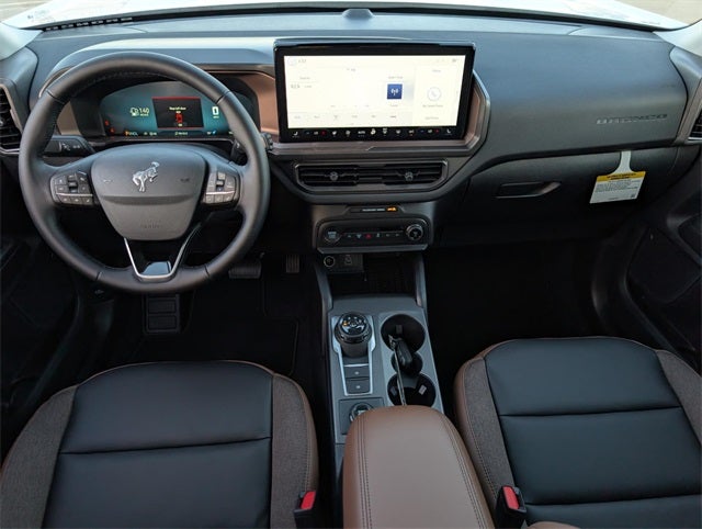 Oxford White 2025 Ford Bronco Sport Outer Banks 4WD 8-Speed Automatic 1.5L EcoBoost 4-Wheel Disc Brakes, 6 Speakers, ABS brakes, Air Conditioning, Alloy wheels, AM/FM radio: SiriusXM, AM/FM Stereo, Auto High-beam Headlights, Auto-dimming Rear-View mirror, Automatic temperature control, Brake assist, Compass, Delay-off headlights, Driver door bin, Driver vanity mirror, Dual front impact airbags, Dual front side impact airbags, Electronic Stability Control, Emergency communication system: SYNC 4 911 Assist, Four wheel independent suspension, Front anti-roll bar, Front Bucket Seats, Front Center Armrest, Front Driver/Passenger Seat Back Map Pockets, Front dual zone A/C, Front fog lights, Front reading lights, Fully automatic headlights, Garage door transmitter, Heated door mirrors, Heated front seats, Heated steering wheel, Illuminated entry, Knee airbag, Low tire pressure warning, Memory seat, Occupant sensing airbag, Outside temperature display, Overhead airbag, Overhead console, Panic alarm, Passenger door bin, Passenger vanity mirror, Power door mirrors, Power driver seat, Power passenger seat, Power steering, Power windows, Premium Trimmed Front Bucket Seats w/Ebony/Roast, Radio data system, Rain sensing wipers, Rear anti-roll bar, Rear Parking Sensors, Rear reading lights, Rear seat center armrest, Rear window defroster, Rear window wiper, Remote keyless entry, Security system, SiriusXM, Speed control, Speed-sensing steering, Speed-Sensitive Wipers, Split folding rear seat, Steering wheel mounted audio controls, SYNC 4 w/Enhanced Voice Recognition, Tachometer, Telescoping steering wheel, Tilt steering wheel, Traction control, Trip computer, Variably intermittent wipers, and Wheels: 18 Ebony Black-Painted Aluminum.