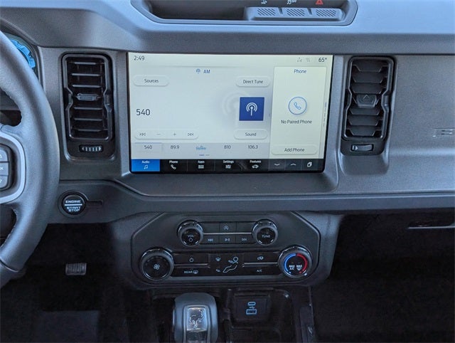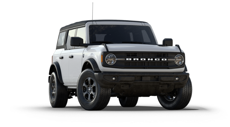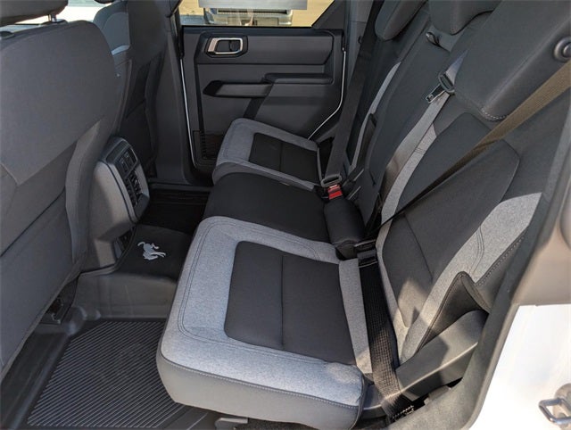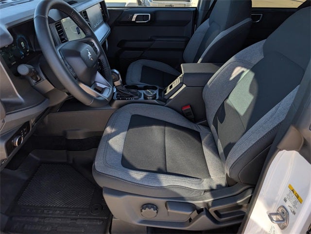 Oxford White 2025 Ford Bronco Big Bend 4WD 10-Speed Automatic 2.3L EcoBoost I-4 4-Wheel Disc Brakes, 4.46 Axle Ratio, 7 Speakers, ABS brakes, Air Conditioning, Alloy wheels, AM/FM radio: SiriusXM with 360L, AM/FM Stereo, Auto High-beam Headlights, Brake assist, Cloth Bucket Seats, Compass, Delay-off headlights, Driver door bin, Driver vanity mirror, Dual front impact airbags, Dual front side impact airbags, Electronic Stability Control, Emergency communication system: 911 Assist, Exterior Parking Camera Rear, Front anti-roll bar, Front Bucket Seats, Front Center Armrest, Front reading lights, Front wheel independent suspension, Fully automatic headlights, Heated door mirrors, Illuminated entry, Integrated roll-over protection, Leather Shift Knob, Low tire pressure warning, Occupant sensing airbag, Outside temperature display, Overhead airbag, Overhead console, Panic alarm, Passenger door bin, Passenger vanity mirror, Power door mirrors, Power steering, Power windows, Radio data system, Remote keyless entry, Security system, SiriusXM w/360L, Speed control, Split folding rear seat, Steering wheel mounted audio controls, SYNC 4, Tachometer, Telescoping steering wheel, Tilt steering wheel, Traction control, Trip computer, Variably intermittent wipers, and Wheels: 17 Carbonized Gray-Painted Aluminum.