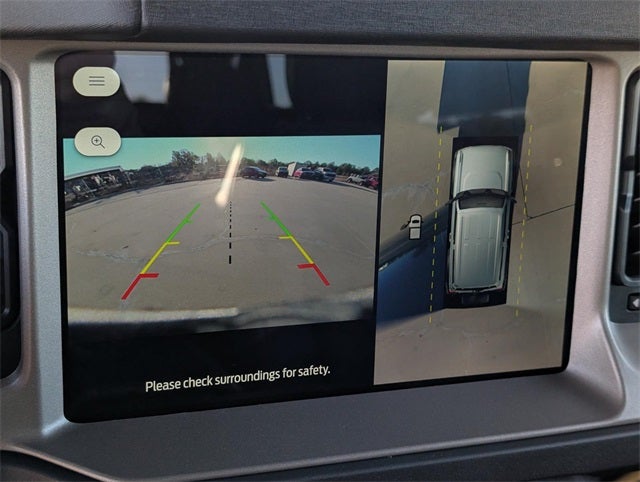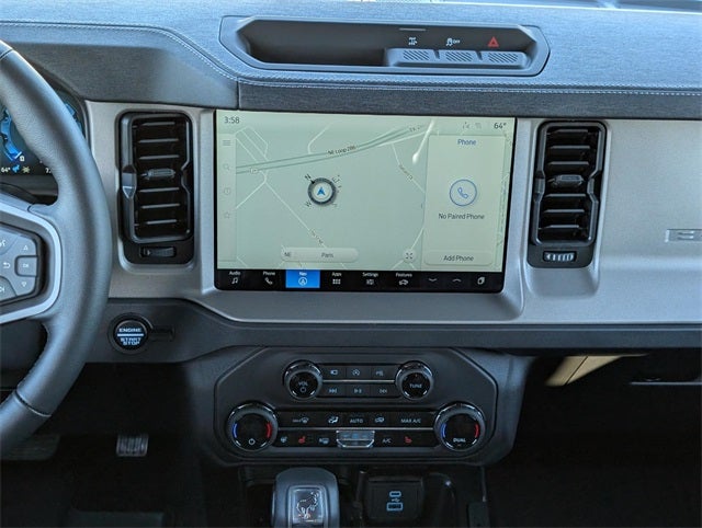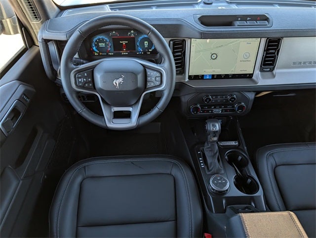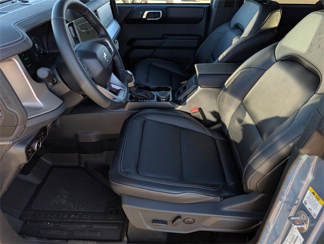 Azure Gray Metallic Tri-Coat 2025 Ford Bronco Outer Banks 4WD 10-Speed Automatic 2.7L EcoBoost V6 Black Appearance Package (Black Molded-In-Color Door Handles, Black Molded-In-Color Fender Flares, Black Molded-In-Color Sideview Mirror Caps, and Black-Painted Molded-In-Color Grille), Equipment Group 314A Lux Package (360-Degree Camera, Adaptive Cruise Control, Evasive Steering Assist, Front Parking Sensors, Information on Demand Panel, Radio: B&O Sound System by Bang & Olufsen, Sideview Mirrors, and Universal Garage Door Opener), 18 Bright Machined Aluminum Wheels, 3.73 Axle Ratio, 4-Wheel Disc Brakes, 7 Speakers, ABS brakes, Air Conditioning, Alloy wheels, AM/FM radio: SiriusXM with 360L, AM/FM Stereo, Auto High-beam Headlights, Auto-dimming Rear-View mirror, Automatic temperature control, Brake assist, Compass, Connected Navigation, Delay-off headlights, Driver door bin, Driver vanity mirror, Dual front impact airbags, Dual front side impact airbags, Electronic Stability Control, Emergency communication system: 911 Assist, Exterior Parking Camera Rear, Front anti-roll bar, Front Bucket Seats, Front Center Armrest, Front dual zone A/C, Front fog lights, Front License Plate Bracket, Front reading lights, Front wheel independent suspension, Fully automatic headlights, Hard Top Sound Deadening Headliner, Heated door mirrors, Heated front seats, Heated Leather-Trimmed/Vinyl Bucket Seats, Heated steering wheel, Illuminated entry, Integrated roll-over protection, Internet access capable: FordPass Connect, Leather Shift Knob, Low tire pressure warning, Navigation system: Connected Navigation, Occupant sensing airbag, Outside temperature display, Overhead airbag, Overhead console, Panic alarm, Passenger door bin, Passenger vanity mirror, Power door mirrors, Power driver seat, Power passenger seat, Power steering, Power windows, Radio data system, Rear seat center armrest, Rear-Window Defroster & Washer, Remote keyless entry, Security system, Shadow Black-Painted Hard Top, SiriusXM w/360L, Speed control, Split folding rear seat, Steering wheel mounted audio controls, SYNC 4, Tachometer, Telescoping steering wheel, Tilt steering wheel, Traction control, Trip computer, Variably intermittent wipers, and Voltmeter.