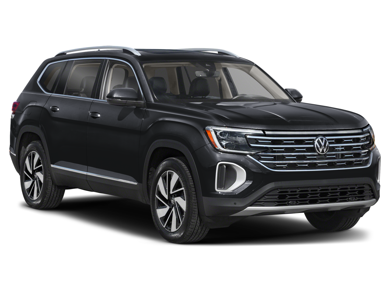 deep black pearl 2026 Volkswagen Atlas 2.0T SEL AWD 8-Speed Automatic with Tiptronic 3rd row seats: split-bench, 4-Wheel Disc Brakes, 4-Wheel Independent Suspension, 6 Speakers, ABS brakes, Air Conditioning, Alloy wheels, AM/FM radio: SiriusXM with 360L, Auto High-beam Headlights, Auto-dimming Rear-View mirror, Automatic temperature control, Brake assist, Bumpers: body-color, Compass, Delay-off headlights, Driver door bin, Driver vanity mirror, Dual front impact airbags, Dual front side impact airbags, Electronic Stability Control, Emergency communication system: VW Car-Net Safe & Secure 5-year, Exterior Parking Camera Rear, Four wheel independent suspension, Front anti-roll bar, Front Bucket Seats, Front Center Armrest, Front dual zone A/C, Front fog lights, Front reading lights, Fully automatic headlights, Garage door transmitter: HomeLink, Heads-Up Display, Heated and Actively Ventilated Front Bucket Seats, Heated door mirrors, Heated front seats, Heated rear seats, Heated steering wheel, Illuminated entry, Low tire pressure warning, Memory seat, Navigation System, Occupant sensing airbag, Outside temperature display, Overhead airbag, Overhead console, Panic alarm, Passenger door bin, Passenger vanity mirror, Perforated Vienna Leather Seating Surfaces, Power door mirrors, Power driver seat, Power Liftgate, Power moonroof: Panoramic, Power passenger seat, Power steering, Power windows, Radio data system, Radio: MIB3 Discover Pro with Navigation, Rain sensing wipers, Rear air conditioning, Rear anti-roll bar, Rear reading lights, Rear seat center armrest, Rear window defroster, Rear window wiper, Remote keyless entry, Security system, Speed control, Speed-sensing steering, Split folding rear seat, Spoiler, Steering wheel mounted audio controls, Tachometer, Telescoping steering wheel, Tilt steering wheel, Traction control, Trip computer, Turn signal indicator mirrors, Variably intermittent wipers, Ventilated front seats, and Wheels: 20 2-Tone Machined Alloy. 2.0L TSI