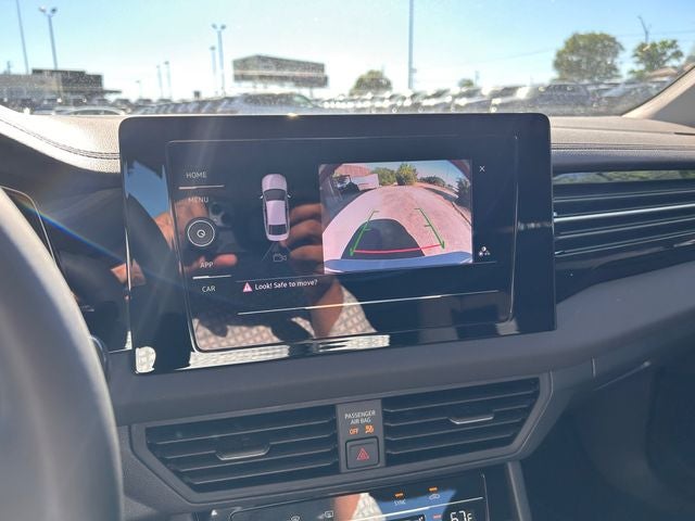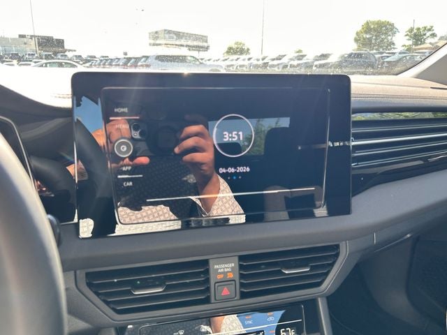 Pure White 2026 Volkswagen Jetta 1.5T S FWD 8-Speed Automatic with Tiptronic Titan Black Cloth. Titan Black Cloth, 4 Speakers, 4-Wheel Disc Brakes, ABS brakes, Active Blind Spot Monitor, Air Conditioning, Alloy wheels, Auto-dimming Rear-View mirror, Automatic temperature control, Brake assist, Bumpers: body-color, Cloth Seat Trim, Delay-off headlights, Driver door bin, Driver vanity mirror, Dual front impact airbags, Dual front side impact airbags, Electronic Stability Control, Emergency communication system: VW Car-Net Safe & Secure 5-year, Exterior Parking Camera Rear, Front anti-roll bar, Front Bucket Seats, Front Center Armrest, Front dual zone A/C, Front Seats, Front wheel independent suspension, Fully automatic headlights, Heated door mirrors, Illuminated entry, Leather Shift Knob, Leather steering wheel, Low tire pressure warning, Occupant sensing airbag, Outside temperature display, Overhead airbag, Overhead console, Panic alarm, Passenger door bin, Passenger vanity mirror, Power door mirrors, Power steering, Power windows, Radio data system, Radio: MIB3 Composition Color with 8 Touchscreen, Rain sensing wipers, Rear anti-roll bar, Rear reading lights, Rear window defroster, Remote keyless entry, Speed control, Speed-sensing steering, Split folding rear seat, Steering wheel mounted audio controls, Tachometer, Telescoping steering wheel, Tilt steering wheel, Traction control, Trip computer, Variably intermittent wipers, and Wheels: 16 2-Tone Machined Alloy. 1.5L I-4 DI DOHC Turbocharged