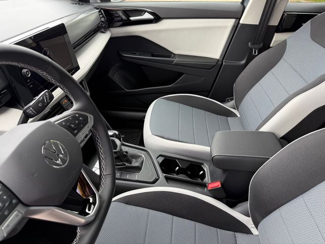 Platinum Gray Metallic 2026 Volkswagen Taos 1.5T S FWD 8-Speed Automatic with Tiptronic 4-Wheel Disc Brakes, 6 Speakers, ABS brakes, Active Blind Spot Monitor, Air Conditioning, Alloy wheels, AM/FM radio, Auto High-beam Headlights, Brake assist, Bumpers: body-color, Cloth Seating Surfaces, Compass, Delay-off headlights, Driver door bin, Driver vanity mirror, Dual front impact airbags, Dual front side impact airbags, Electronic Stability Control, Emergency communication system: VW Car-Net Safe & Secure 5-year, Exterior Parking Camera Rear, Front anti-roll bar, Front Bucket Seats, Front Center Armrest, Front reading lights, Front Strut Rear Torsion Beam Suspension, Front wheel independent suspension, Fully automatic headlights, Heated steering wheel, Illuminated entry, Leather Shift Knob, Low tire pressure warning, Occupant sensing airbag, Outside temperature display, Overhead airbag, Overhead console, Panic alarm, Passenger door bin, Passenger vanity mirror, Power door mirrors, Power steering, Power windows, Radio data system, Radio: MIB3 Composition Color AM/FM, Rain sensing wipers, Rear anti-roll bar, Rear seat center armrest, Rear window defroster, Rear window wiper, Remote keyless entry, Speed control, Speed-sensing steering, Split folding rear seat, Spoiler, Steering wheel mounted audio controls, Tachometer, Telescoping steering wheel, Tilt steering wheel, Traction control, Trip computer, Variably intermittent wipers, and Wheels: 17 Dark Silver Painted Alloy. 1.5L I4 Turbocharged DOHC 16V LEV3-SULEV30 174hp